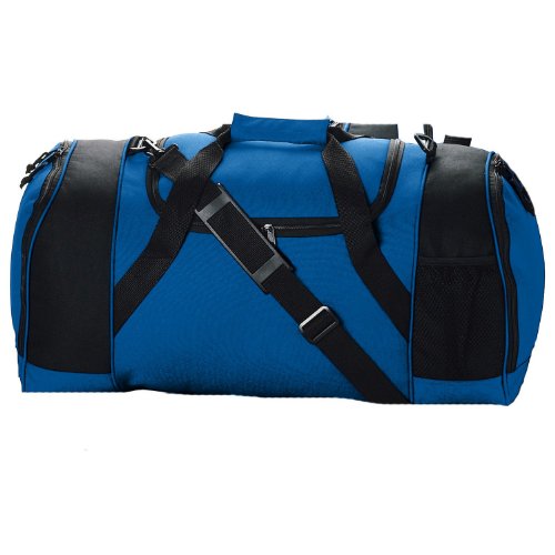 Augusta Sportswear ball pocket duffle bag. 1900, 600-denier polyester with PVC coating, Zippered main compartment has large U-shaped opening with two zipper pulls, Right side zippered ball compartment, Left side zippered compartment with outside mesh water bottle pocket, Web handles with self-fabric handle wrapper reinforced at stress points, Adjustable and detachable shoulder strap with black rubber shoulder guard, Plastic hardware, Self-fabric piping, Durable vinyl on bottom of bag to retain shape. 25" x 12" x 12"