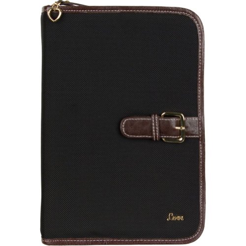 - Rugged yet elegant black nylon with leather-look trim and gold metal decorative buckle, heart zipper pendant and Love message adorn this tasteful cover.