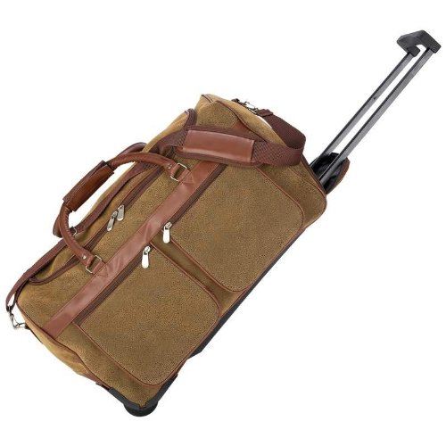 Features high quality man-made Angola material, multiple pockets, full lining, locking telescoping trolley handle, detachable padded shoulder strap, padded hand strap, and reinforced double layer bag bottom. Measures 11-3/8" x 21" x 13".
