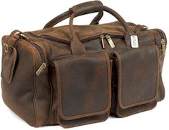 If you like the vintage leather look (and who doesn't?) this duffle bag is for you. The finest grade of vaquetta leather which is very thick and durable yet surprisingly lightweight. Features; large interior with heavy duty zippers that zip around allowing easy access to the interior, heavy duty leather shoulder strap with bold hardware, satiny lining that is gorgeous and durable, two large front pockets with magnetic closures, one large zippered pocket on the backside, side zippered pocket on both sides and a beautiful leather ID tag with bold hardware. Measures: 10"x20"x10"